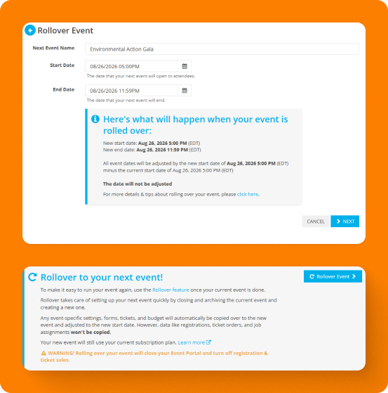 Hosting the same event annually or multiple times a year? With a single click of a button, duplicate a past event to instantly reuse registration forms, tickets, schedules, branding, and setup preferences—so you can focus on what’s new, not starting from scratch.