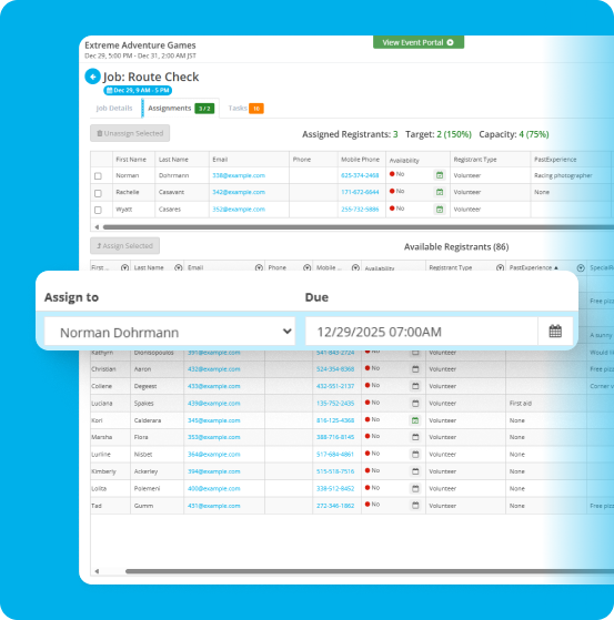 Define jobs to communicate responsibilities, timing, location, and a task checklist—so your volunteers, staff and other key players have everything they need, when they need it. No more confusion, no last-minute paper handouts, and no gaps in work coverage. Effortlessly communicate job assignments to volunteers and staff well ahead of your event.