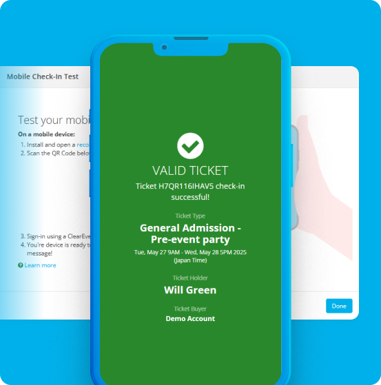 Use your phone’s camera and ClearEvent’s mobile check-in tool to scan tickets at the door. Instantly verify ticket details, prevent duplicate check-ins, and keep your guest list accurate in real time.